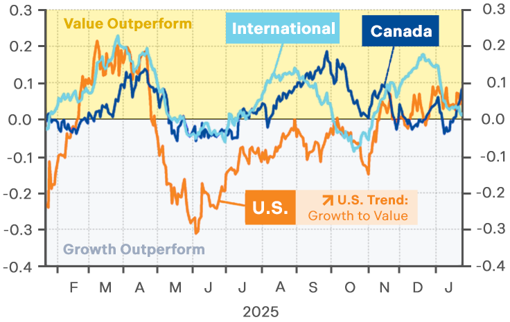 This rotation is already visible in the data. The chart below tracks ‘Value’ equities versus ‘Growth’ equities returns across major regions, where readings above the zero line in the chart indicate that Value is outperforming, and readings below zero signal Growth dominance. While Value outperformed Growth in Canadian and International markets (green and blue lines) for most of 2025, the U.S. market (red line) showed a strong bias for Growth after the “Liberation Day” market turmoil. Beginning last June, the trend reversed, and now in 2026 we see all three regions showing Value returns outpacing Growth. |