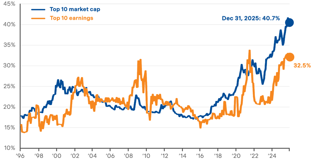 Artificial intelligence has undeniably been the driving force of today’s market. As we noted in our recent analysis, “The Trillion Dollar Question,” our view remains that we are still in the early stages of this shift, and the massive capital expenditures by hyperscalers represent a necessary retooling of the economy rather than a bubble.1 However, this enthusiasm has created an historically imbalanced US market structure. By late 2025, the top 10 stocks in the S&P 500 grew to account for approximately 41% of the entire index—a level of crowding not seen in decades.2 Consequently, many portfolios are now inadvertently exposed to a single sector, leaving investors vulnerable to volatility even if the long-term AI thesis holds true. |