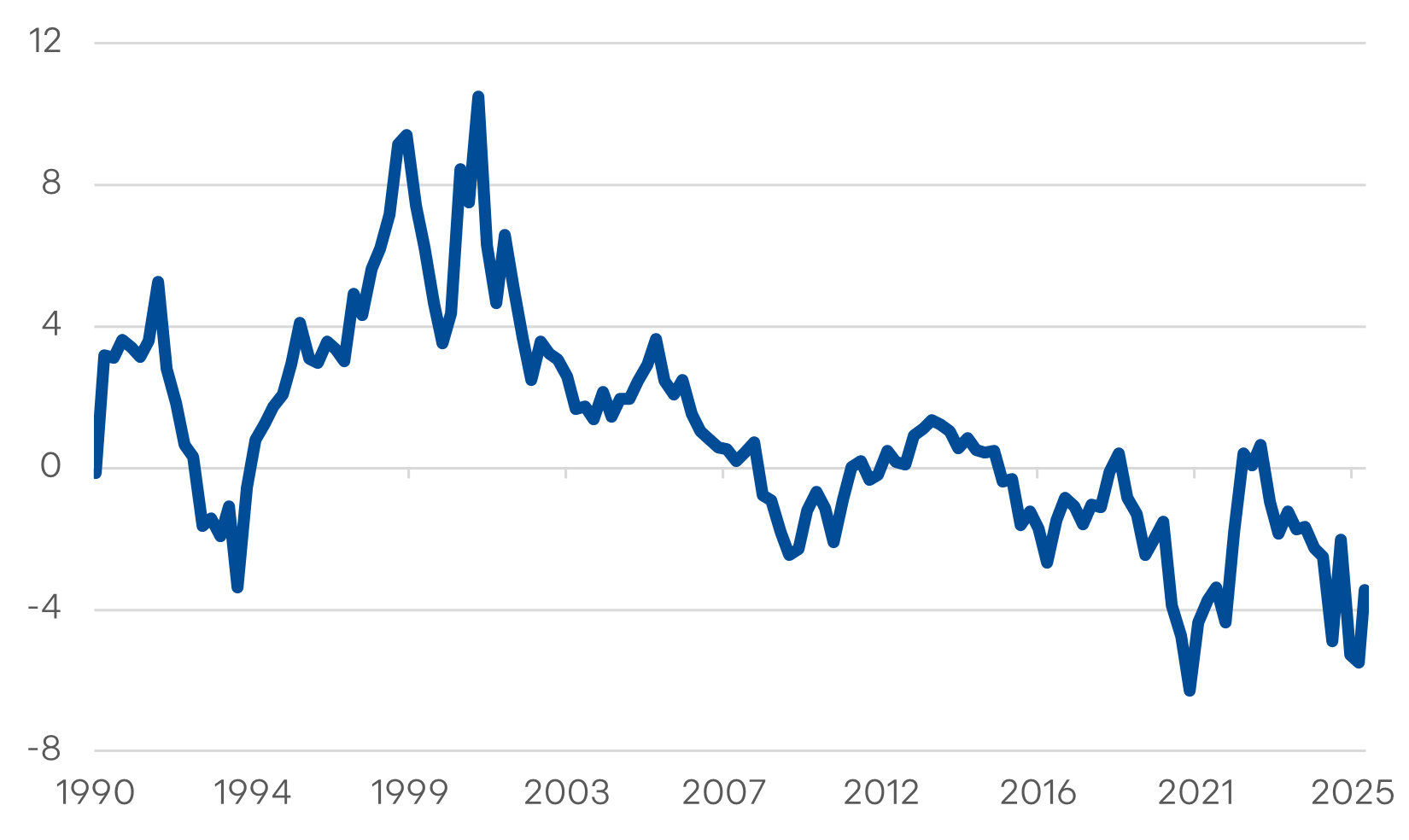 Healthcare has lagged the broader market in recent years, particularly in 2024 when the S&P 500 Healthcare Total Return Index was up 2.6% versus the S&P 500 Index up 25%.1 We believe this can be attributed to political debates over drug pricing, uncertainty around Medicare negotiations, tariff concerns, delays at the FDA, and rising medical costs at insurers. As a result, sector valuation sits in the bottom 6th percentile of the last 30 years, signaling deep discounts relative to long-term history (see Figure 1). We believe healthcare is entering one of the most attractive investment environments it has seen in years. A combination of falling interest rates, improving earnings, attractive valuations, easing policy risk, and a strengthening merger-and-acquisition (M&A) cycle is now coming together. These forces create a powerful setup for long-term investors. In 2025, the performance gap between healthcare and the broader market narrowed, 14.6% versus 18% respectively with significant outperformance in Q4, 12% versus 3%.1 Despite recent gains, healthcare is still under-owned by investors given its longer-term lag. We believe this under positioning could provide additional performance tailwind beyond just fundamentals and improving macro environment. |